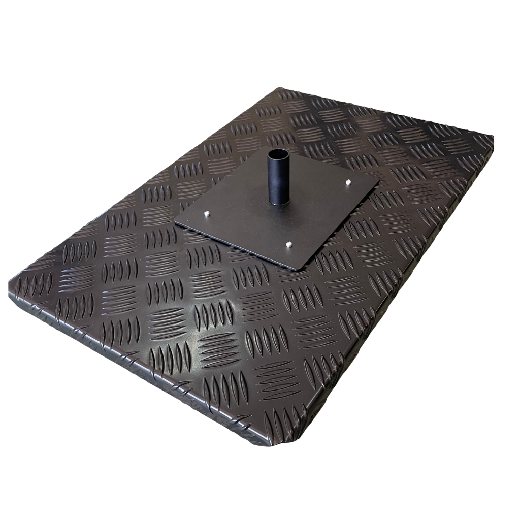 Aluminium chequer-plate tray with upturned edges. Includes swivel mounting plate attachment. Fits existing BBQARM arms.